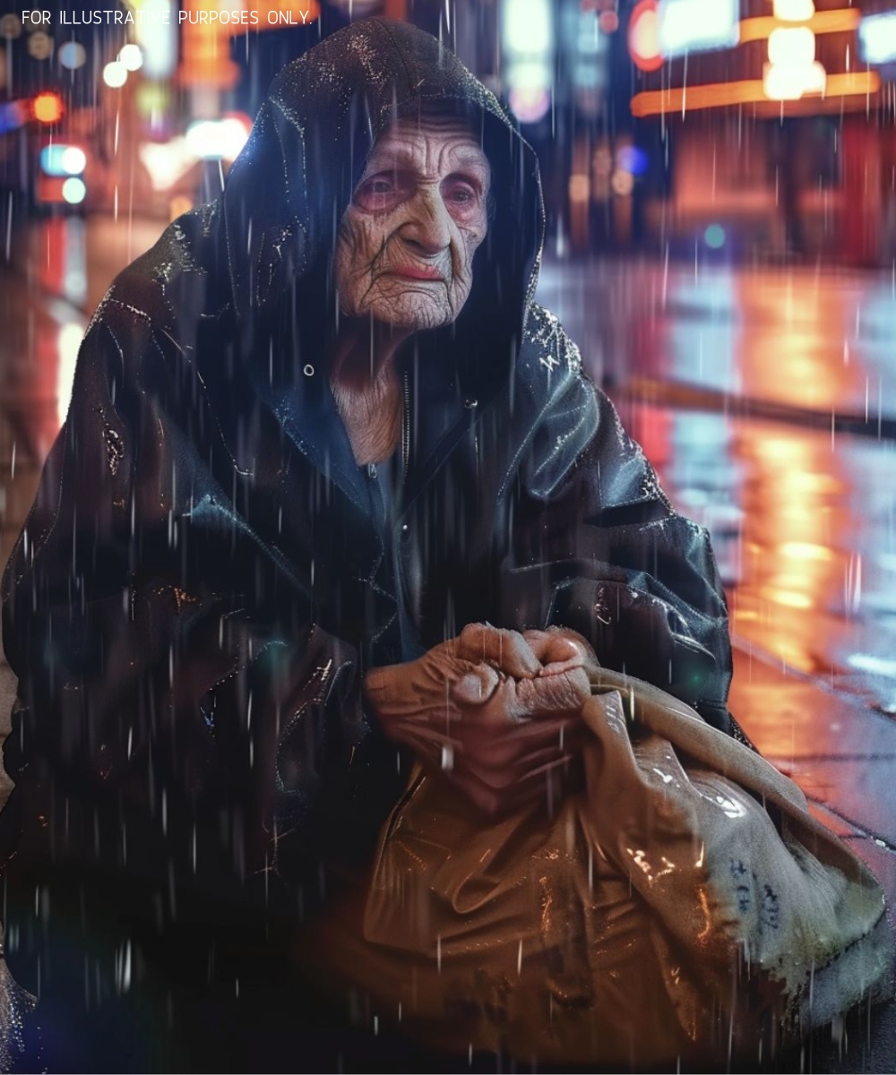 Ze zat ineengedoken op de stoeprand onder een zwakke lantaarnpaal, doorweekt en roerloos. Ze was ouder, misschien eind vijftig of begin zestig, maar er was iets vreemds aan haar.