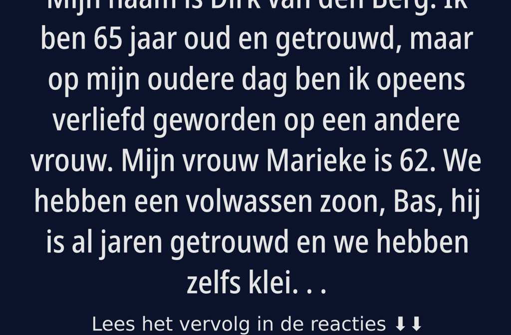 Mijn naam is Dirk van den Berg. Ik ben 65 jaar oud en getrouwd, maar op mijn oudere dag ben ik opeens verliefd geworden op een andere vrouw. Mijn vrouw Marieke is 62. We hebben een volwassen zoon, Bas, hij is al jaren getrouwd en we hebben zelfs kleinkinderen. Na zijn vertrek uit huis leek het alsof Marieke en ik elkaar nauwelijks meer begrepen; onze levens liepen naast elkaar, zonder raakvlak.