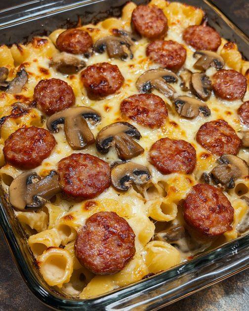 Deze ovenschotel met worst, champignons en pasta is het ultieme comfortfood. Malse pasta en hartige Italiaanse worst worden gecombineerd met aardse champignons in een rijke, romige saus, vervolgens afgetopt met gesmolten mozzarella en Parmezaanse kaas en gebakken tot het goudbruin en bubbelend is. Dit stevige eenpansgerecht is perfect voor een gezellig familiediner.