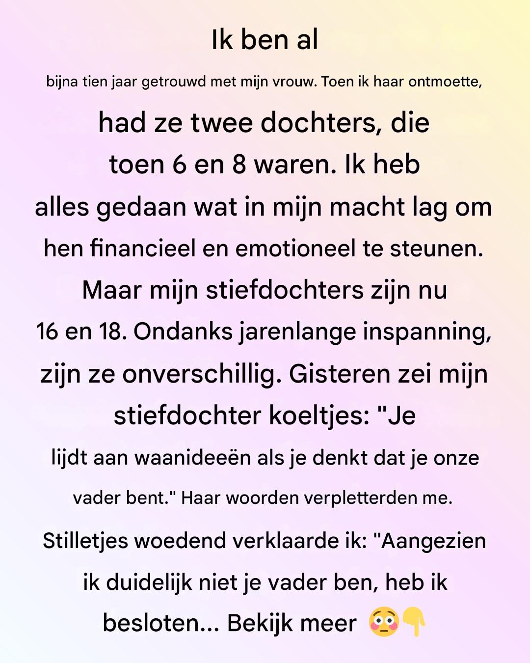 Ik ben al bijna tien jaar getrouwd met mijn vrouw, Julia. Toen ik haar ontmoette, had ze twee dochters, Ava en Bella, die toen 6 en 8 waren. Ik hield echt van Julia, en vanaf het begin wist ik dat ik meer wilde zijn dan alleen een stiefvader – ik wilde een vaderfiguur zijn voor Ava en Bella.
