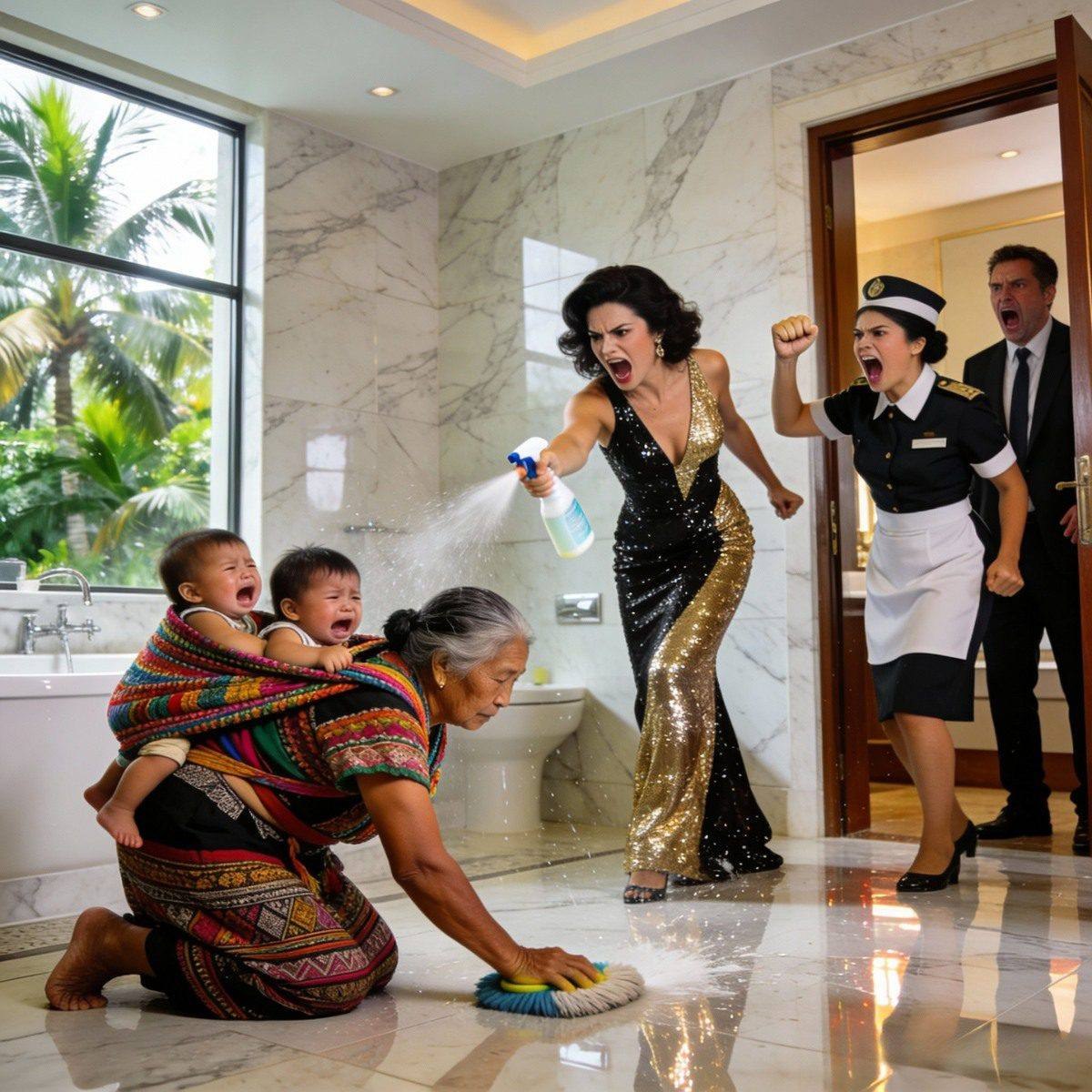Mijn moeder, Doña Elena, een 72-jarige vrouw met artritis in haar handen, knielde op de ijskoude marmeren vloer. Ze was gebogen en bovenop haar, strak vastgebonden met een sjaal, lagen mijn twee kinderen, zwaar en huilend. Ze probeerde de voet van het toilet schoon te schrobben met een oude spons.