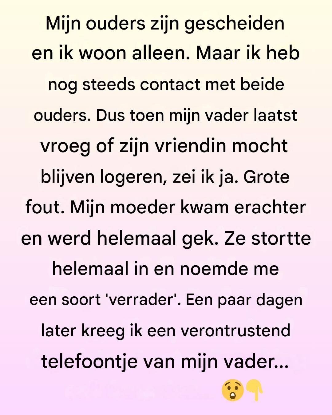 Dus, even een korte achtergrond: mijn ouders zijn gescheiden en haten elkaar tot in het diepst van hun ziel. Een soort haat die al tientallen jaren oud is, en nog steeds sluimert. Ik woon alleen in een appartement waar ze me allebei financieel steunen. Ja, ik weet het, het is nu al een lastige situatie.