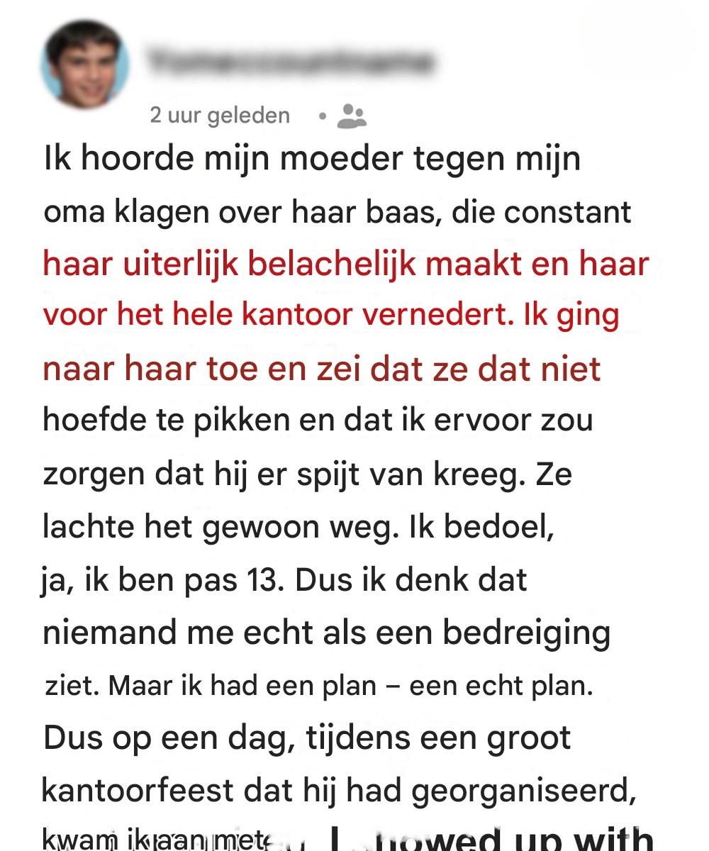 Toen ik een uitnodiging kreeg voor Richards bedrijfsdiner, wist ik dat dit mijn kans was. Met de hulp van Richards dochter, Zoe – die bij mij op school zat – kreeg ik opnames van zijn wrede woorden.
