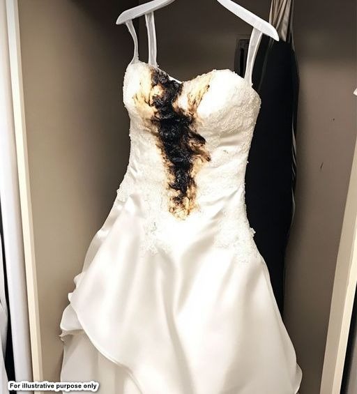 Eerst kon ik niet bevatten wat ik zag. De kledingzak ging open en daar lag mijn jurk, maar hij zag er… vreemd uit.