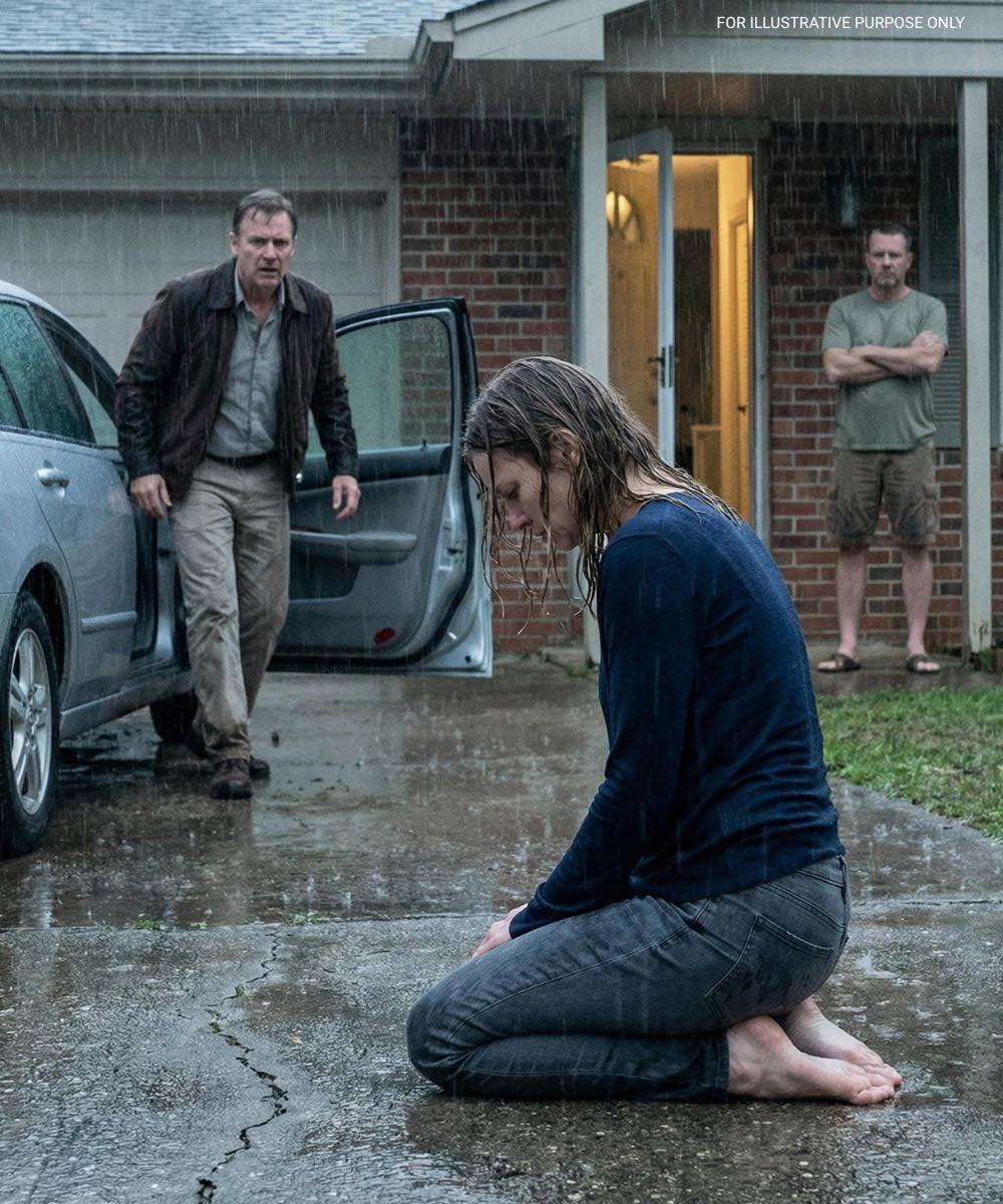 Het duurde even om te begrijpen wat ik zag. Geen enkele ouder stelt zich voor dat ze hun volwassen kind zo vinden - knielen, hoofd neergelaten, schouders naar binnen gekruld, regen die haar haar mat en haar gezicht streakt alsof de lucht haar zelf straft. Maar toen ze net genoeg haar ogen optilde, angst onmiskenbaar en naakt, wist ik het.