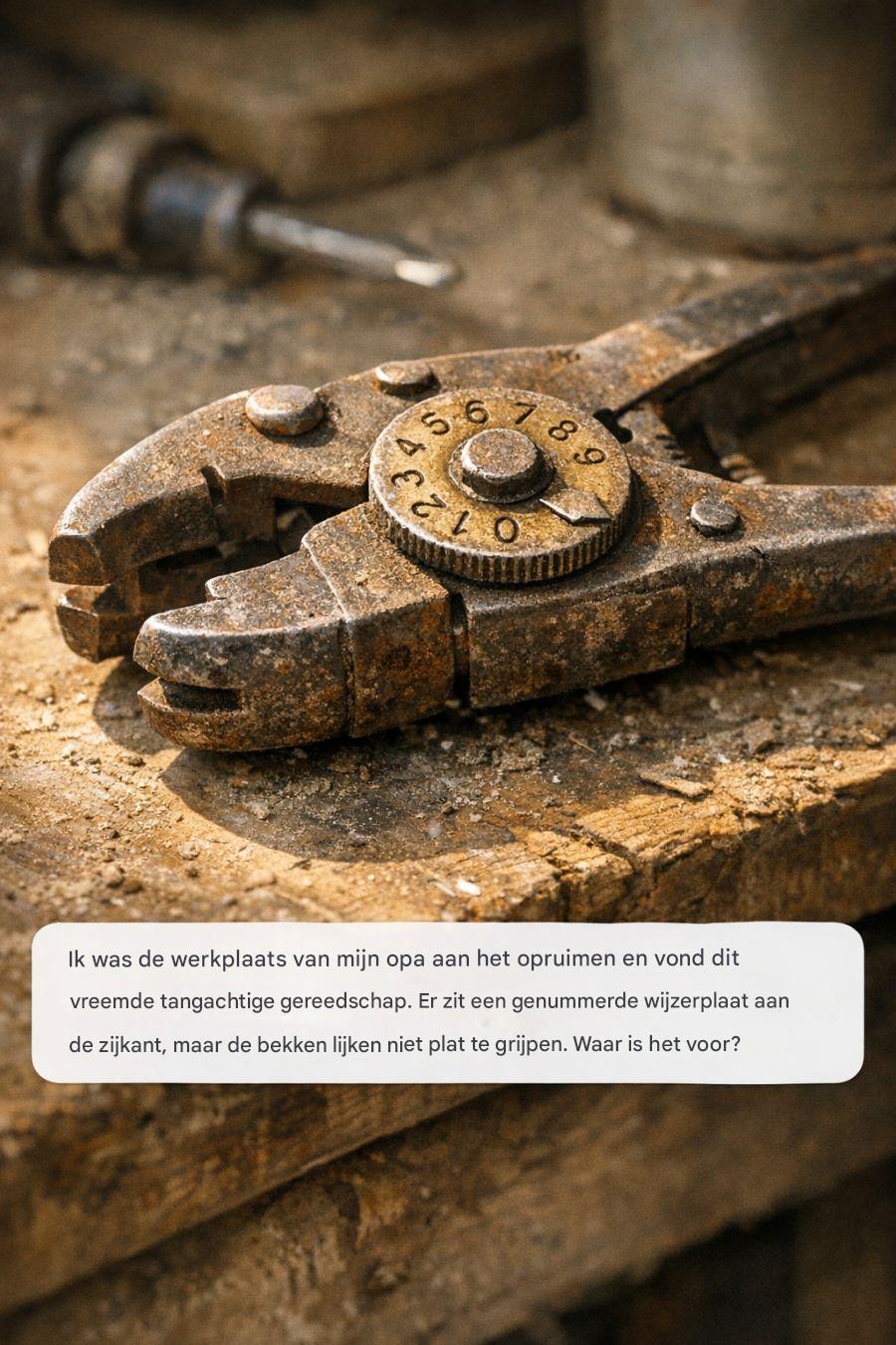 Het opruimen van de werkplaats van een dierbare kan een emotionele reis zijn, vol nostalgie en ontdekkingen. Tussen de bekende gereedschappen en materialen kun je zomaar iets vinden dat je nieuwsgierigheid en een gevoel van mysterie oproept. Dat was het geval toen ik een eigenaardig tangachtig gereedschap vond in de werkplaats van mijn opa. In tegenstelling tot gewone tangen of moersleutels had dit gereedschap een ongebruikelijke bekvorm en een genummerde wijzerplaat aan de zijkant, wat me aanzette tot een dieper onderzoek naar het doel en de geschiedenis ervan.