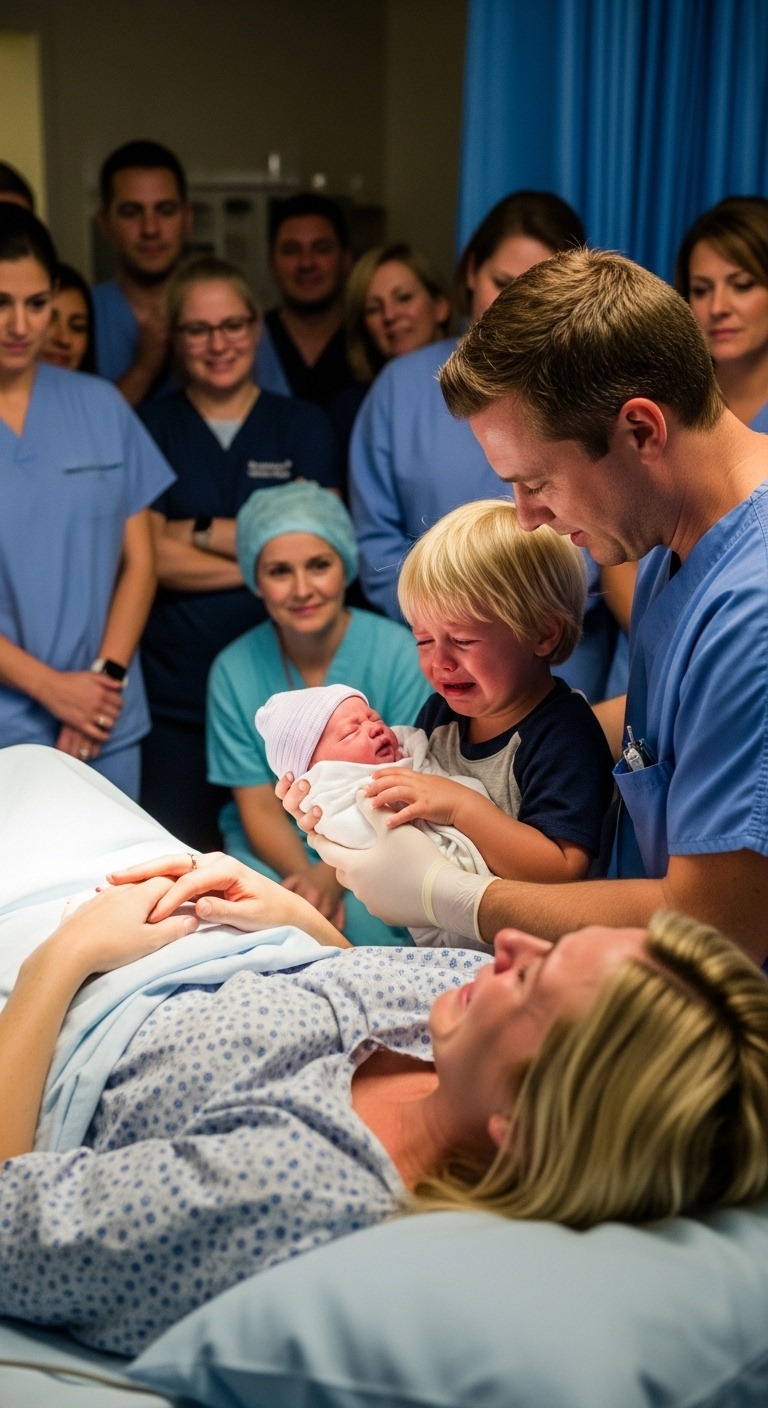 In het ziekenhuis werd de serene sfeer op de kraamafdeling verstoord door een wervelwind van gecontroleerde chaos. Dr. Erica Lewis, een vrouw met vriendelijke ogen maar een no-nonsense houding, onderzocht een nu halfbewuste Laura, haar gezichtsuitdrukking werd met de seconde grimmiger. Ze vond David in de gang, zijn gezicht een masker van verwoede zorgen. « Ze lijdt aan een ernstige placenta-abruptie, » legde ze uit, haar stem laag en dringend. « De placenta is losgekomen van de baarmoederwand. We verliezen haar, en we verliezen de baby. We moeten onmiddellijk werken. Haar leven en dat van uw zoon zijn in groot gevaar. »