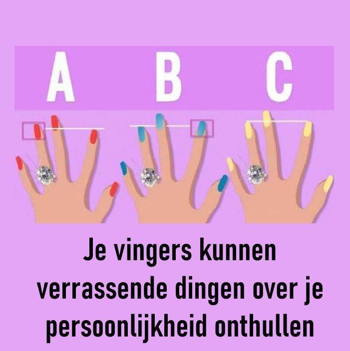 Kijk naar je rechterhand en vergelijk de lengte van je ringvinger (de vierde vinger) en je wijsvinger (de tweede vinger).