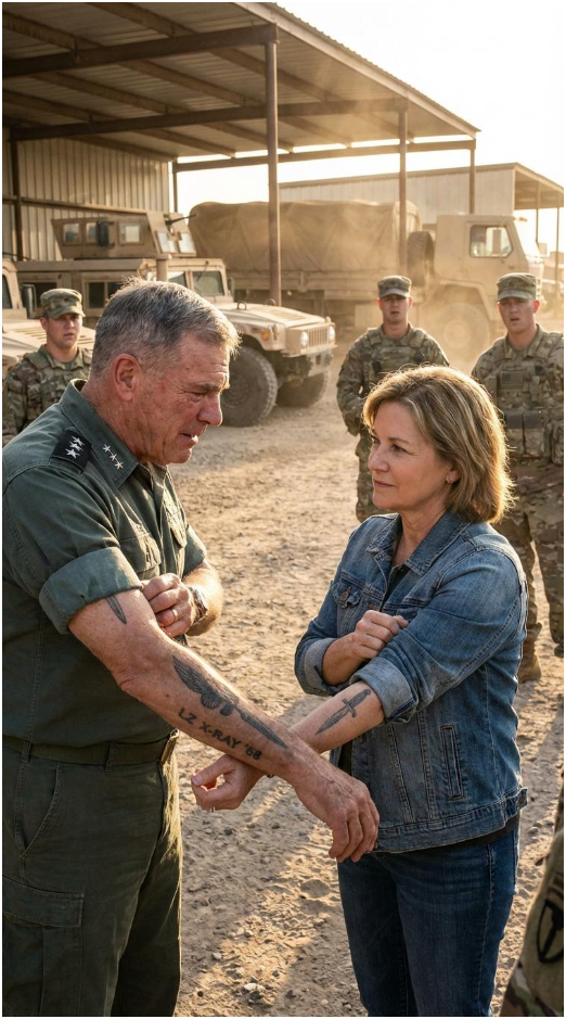 Het eerste wat hem opviel was niet mijn badge, of de inspectielabels op mijn klembord, of de momentsleutel die tegen de band van het gepantserde voertuig achter me rustte, maar de vervaagde inkt op mijn bovenarm, het soort inkt dat zich moeilijk laat fotograferen en betekenisloos lijkt tenzij je de taal die het spreekt al kent. En toen hij lachte, was het eerst niet hard, slechts een korte ademhaling door zijn neus, alsof de grap hem zelfs had verrast door hoe makkelijk hij was.