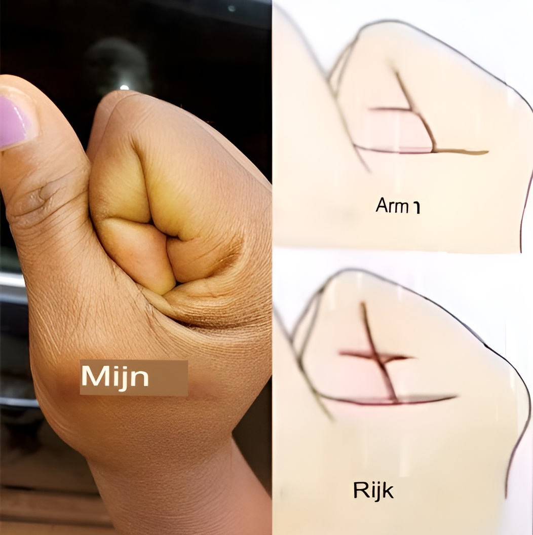 Stel je een gesloten handpalm voor met kruisende lijnen bij de basis van de duim, gelabeld als ‘arm’. Volgens sommige handlezers duidt dit patroon op een leven dat gekenmerkt wordt door financiële moeilijkheden of gebrek aan voorspoed. De symboliek is krachtig: de lijnen weerspiegelen obstakels of beperkingen bij het vergaren van rijkdom.