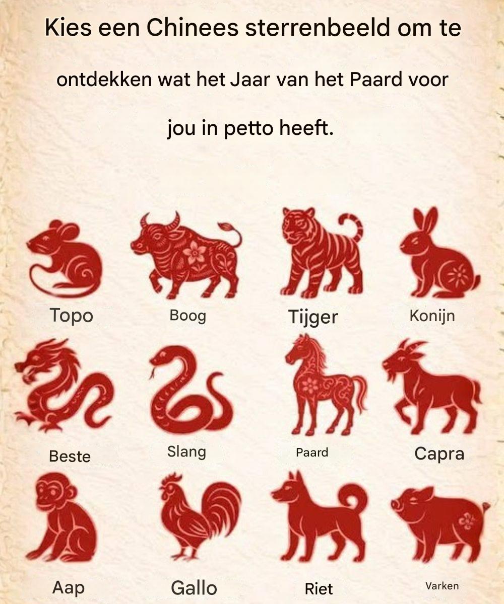 Neem even de tijd om hieronder je teken te kiezen en ontdek wat het jaar van het paard waarschijnlijk voor jou in petto heeft.