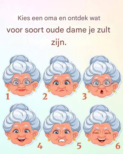 Als je kiest voor Oma nummer 5, dan ben jij het type oude dame dat geen blad voor de mond neemt! Je hebt een scherpe geest en een vurige persoonlijkheid, en je tolereert geen onzin. Mensen respecteren je omdat je brutaal eerlijk bent, maar tegelijkertijd ontzettend liefdevol. Jij bent de matriarch die het huishouden met kracht en wijsheid leidt en ervoor zorgt dat iedereen op het rechte pad blijft.