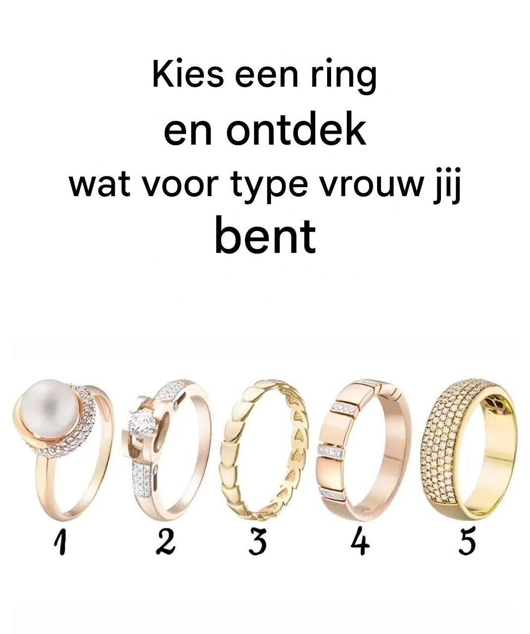 Kijk naar de vijf ringen hieronder (of stel je ze voor als de afbeelding er niet bij staat), kies de ring die je het meest aanspreekt, zonder er al te veel over na te denken. Ontdek vervolgens wat deze keuze onthult over de vrouw die je bent. Klaar? Aan de slag!