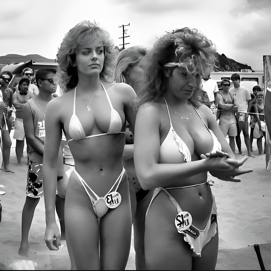Deze foto werd genomen in 1986 tijdens een bikiniwedstrijd in Californië, op het beroemde Venice Beach. Het evenement trok veel enthousiaste toeschouwers die de moedige en zelfverzekerde deelneemsters, waaronder het model Leslie Bremmer, bekeken. De wedstrijd was niet alleen een sportevenement, maar ook een symbool van de strandcultuur van die tijd, die de schoonheidsidealen van die tijd weerspiegelde. In de jaren ’80 werd lichamelijke schoonheid en openbare zelfvertrouwen de belangrijkste waarden. Het was toen dat de Amerikaanse bikinicultuur echt begon te groeien, en vrouwen ontdekten steeds meer hun eigen stijl, waardoor ze moediger en zelfverzekerder werden.