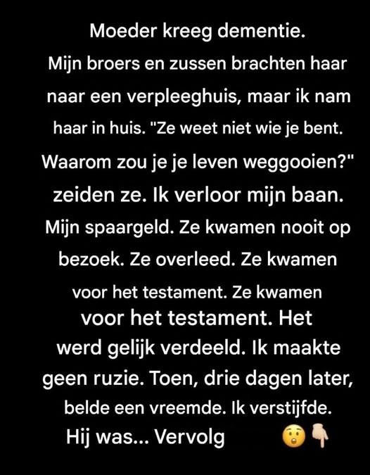 Het sloop er stilletjes in. In het begin was het onschuldig: een verloren bril, afspraken die ze vergat, verhalen die ze onbewust herhaalde. Toen glimlachte ze me op een middag beleefd toe en vroeg of ik in de buurt woonde. Later legde een dokter de diagnose met beheerste kalmte uit, met woorden als ‘geleidelijk’ en ‘onzeker’. Mijn broers en zussen schakelden meteen over op probleemoplossing en vergeleken verzorgingstehuizen, kosten en logistiek alsof ze cijfers op een balans bespraken. Ik bleef stil, wetende dat ik haar niet kon achterlaten op een plek die vreemd aanvoelde. Ik nam haar in huis, ondanks waarschuwingen dat het mijn leven zou beheersen en dat ze misschien nooit zou begrijpen wat ik opgaf.