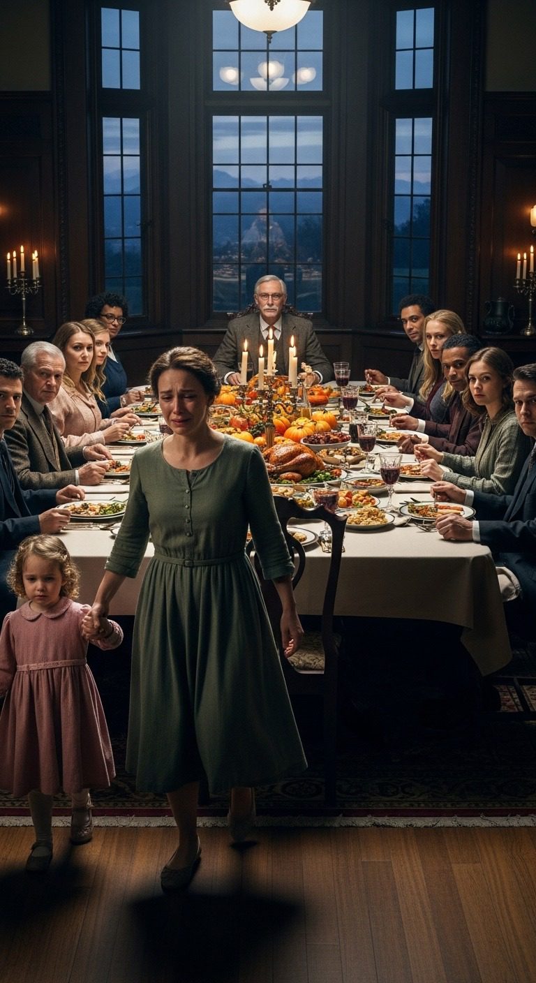 Mijn vader beschouwde mijn twaalfjarige dochter alsof ze niets meer was dan een meubelstuk dat hem in de weg stond. Niet zijn kleindochter, niet zijn familie, maar gewoon een ongemak dat tussen hem en zijn perfect georganiseerde Thanksgiving-diner in stond. De kroonluchter in de eetkamer, een monsterlijk ding van kristal en messing, wierp lange schaduwen over zijn gezicht toen hij zijn hand opstak en naar de keuken wees. Zijn zware gouden trouwring ving het licht op.