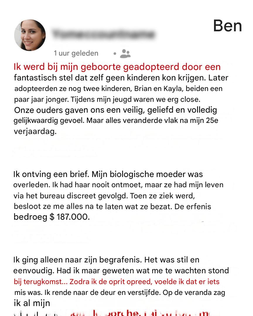 De brief die mijn leven veranderde, arriveerde in een crèmekleurige envelop met een postzegel van een advocatenkantoor. Ik opende hem meteen, maar het kostte me drie keer lezen om de informatie echt te verwerken.