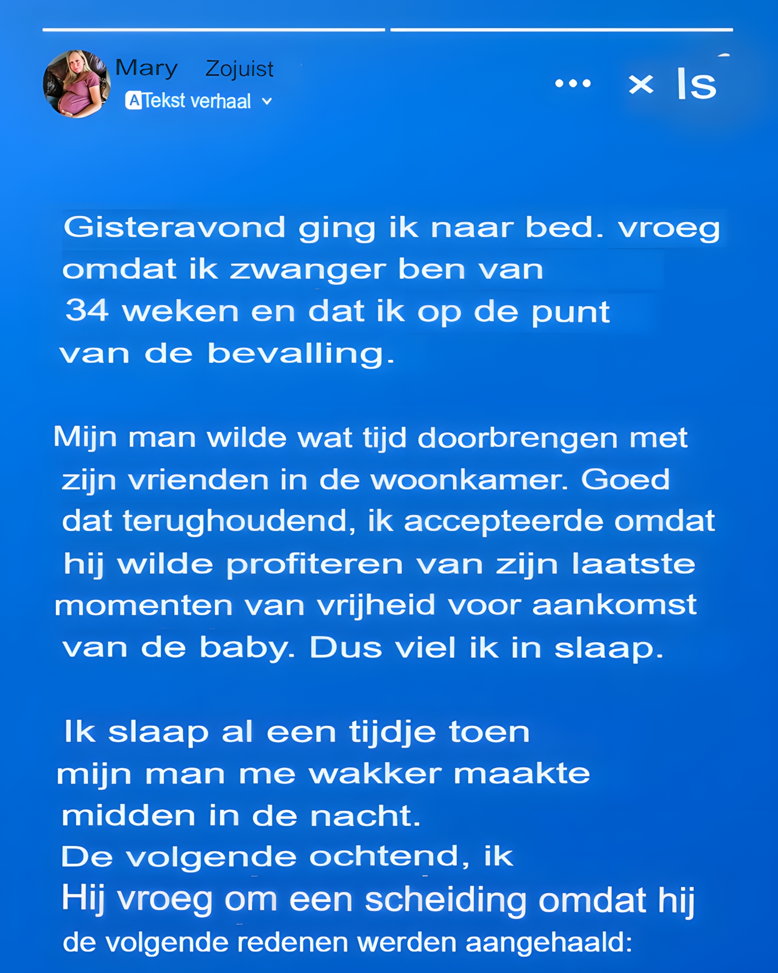 Ik was 34 weken zwanger en sliep. Midden in de nacht werd ik wakker geschud door het aanhoudende gehuil van mijn man. Zijn redenering zette mijn wereld op zijn kop en de volgende ochtend had ik geen andere keuze dan een scheiding aan te vragen.