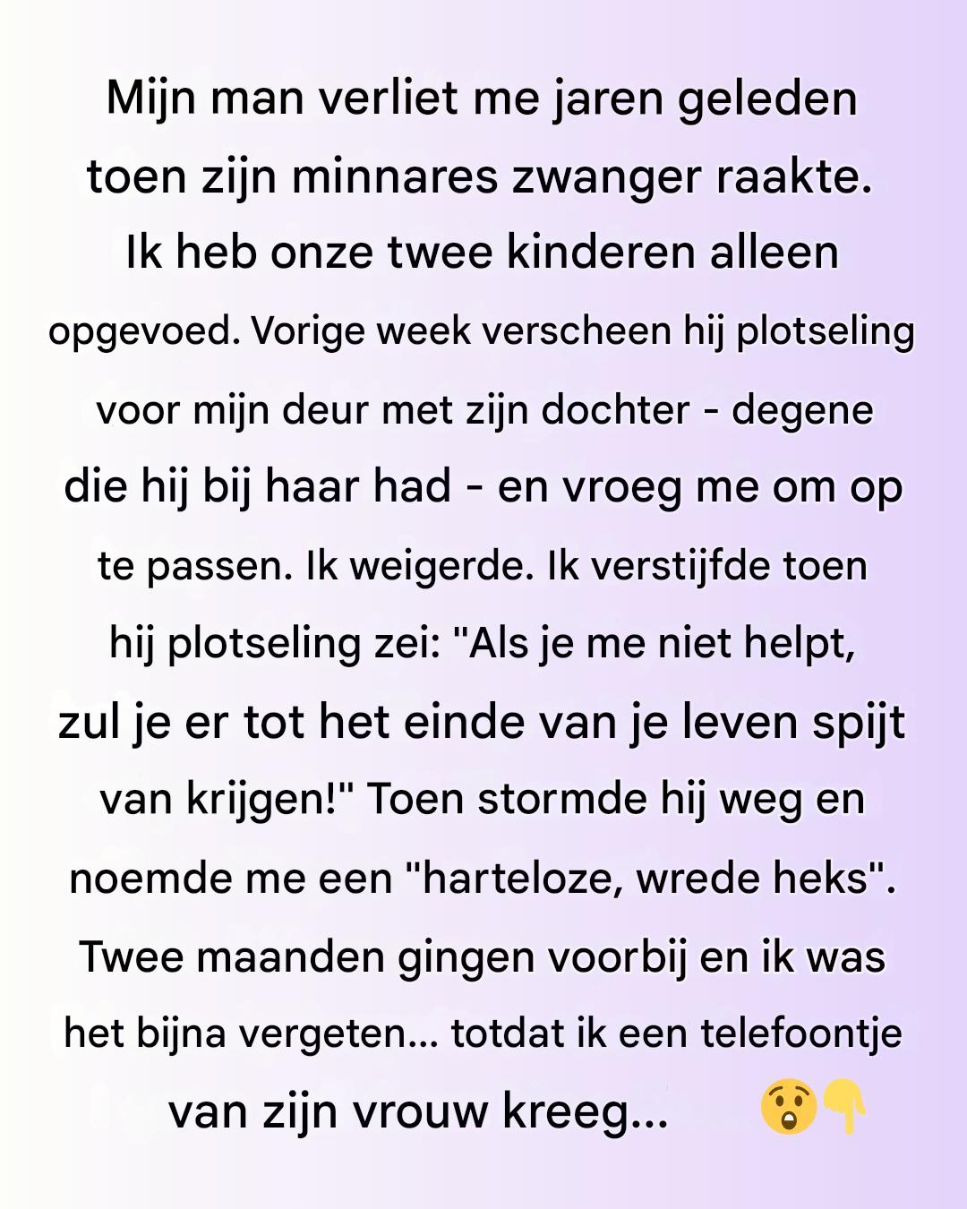 Ik ben 34 en mijn ex-man van 36 heeft me jaren geleden in de steek gelaten toen zijn minnares zwanger raakte. Sindsdien voed ik onze twee kinderen alleen op. Vorige week stond hij plotseling voor de deur met zijn dochter – de dochter die hij bij haar had – en vroeg me om op te passen.