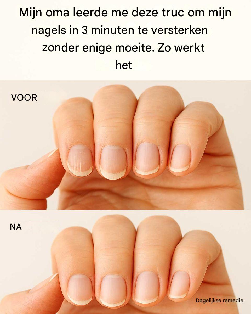 Deze truc is een familiegeheim, al generaties lang doorgegeven en heeft de tand des tijds doorstaan. Perfect voor diegenen onder ons die altijd onderweg zijn, maar toch een verzorgde uitstraling willen behouden. Stel je voor dat je nagels er niet alleen sterk uitzien, maar er ook professioneel verzorgd uitzien, zonder dat je daarvoor dure salonbezoeken nodig hebt. Laten we eens duiken in deze ongelooflijke nagelversterkende routine die slechts drie minuten en een paar veelgebruikte huishoudelijke ingrediënten vereist.