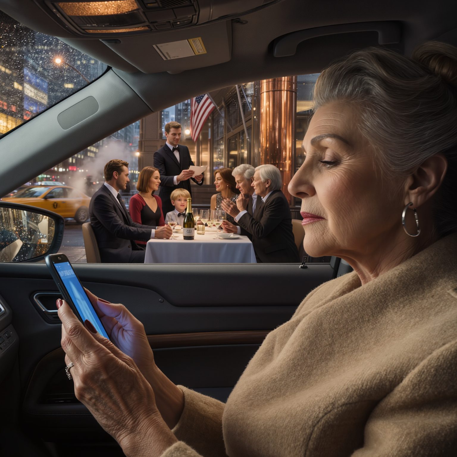 Matthew, mijn zoon, zat aan een grote tafel vlak bij het raam te lachen, met een glas rode wijn in zijn hand, en toostte. Naast hem zat Valerie in die strakke zwarte jurk die ik haar nog nooit had zien dragen. Haar haar in een stijlvolle knot, alsof ze de koningin van de nacht was.