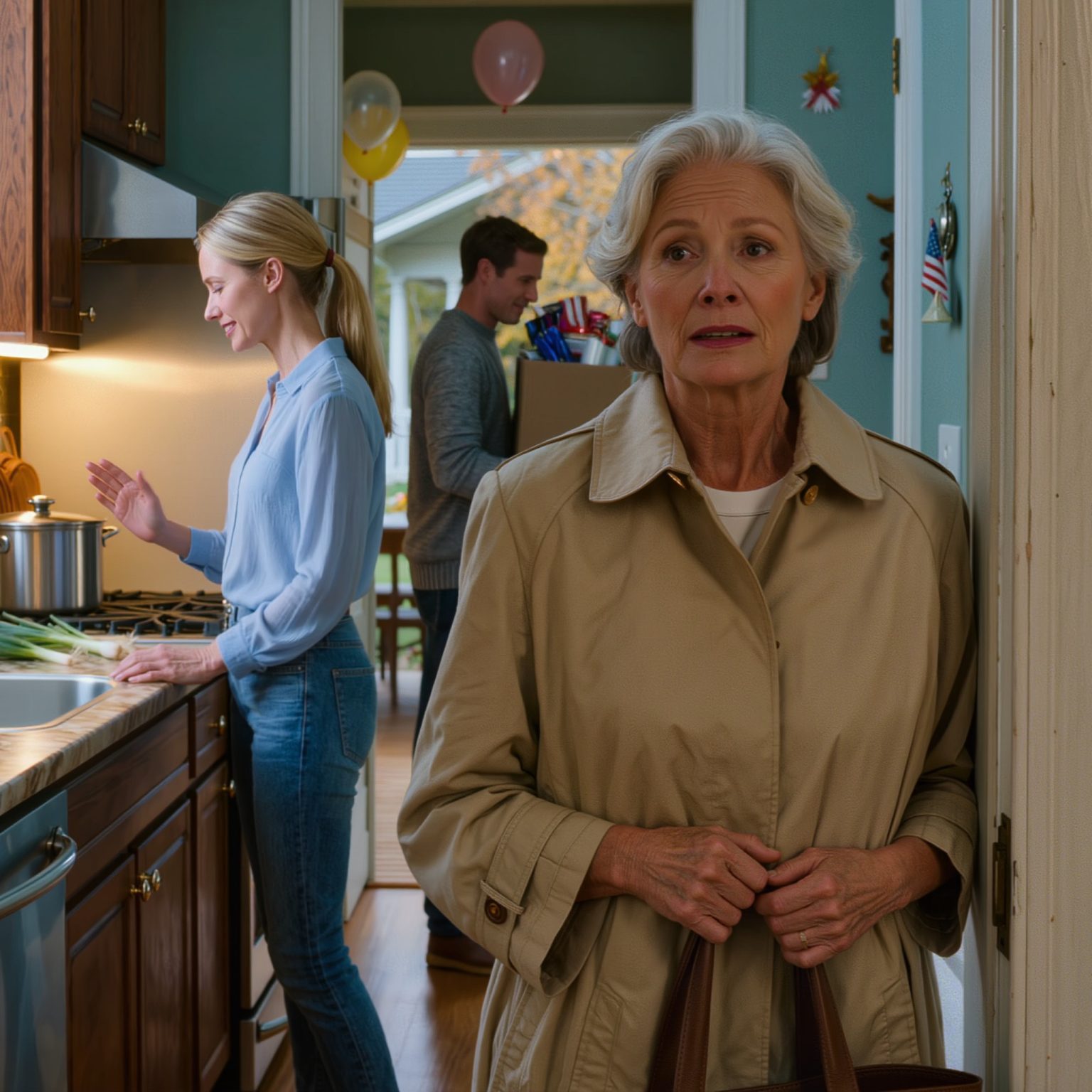 Mijn schoondochter, Rachel, bewoog zich door alles heen met de precisie van een orkestdirigent, haar blonde paardenstaart zwiepte heen en weer terwijl ze zich van fornuis naar gootsteen naar koelkast bewoog. Ik stond bij de deuropening met mijn jas nog aan, net aangekomen na een autorit van drie uur van Pittsburgh naar hun huis buiten Philadelphia.