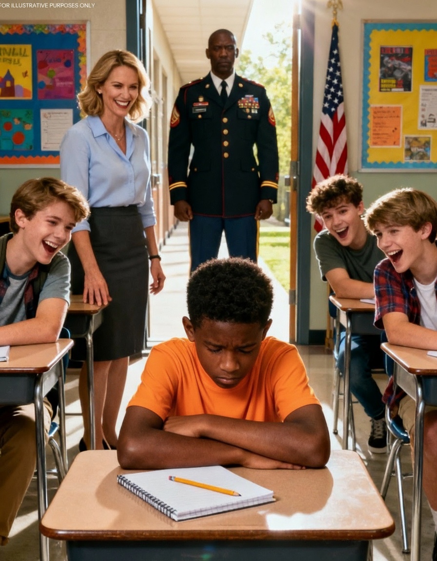 De leerlingen stelden zich na de pauze op, nog steeds kletsend. Toen werd het stil in de gang. Het geluid van zware, afgemeten voetstappen echode richting het klaslokaal. Elk hoofd draaide zich om toen een lange man in een gedecoreerd militair uniform door de deuropening stapte. Zijn medailles vingen het licht. Zijn houding straalde een stille autoriteit uit.