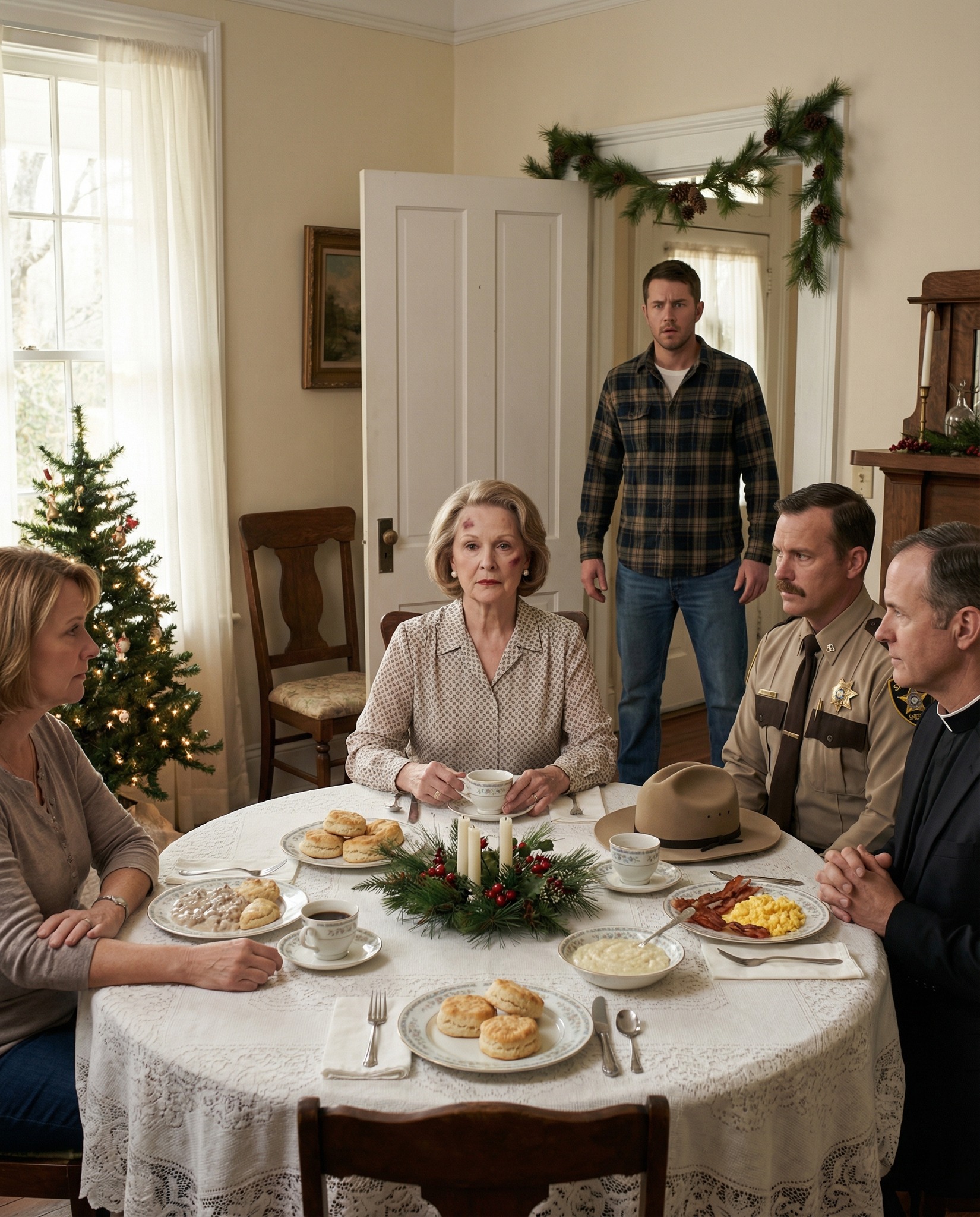 Mijn zoon sloeg me gisteravond, en ik zei niets. Vanmorgen spreidde ik mijn kanten tafelkleed uit, maakte een uitgebreid Zuidelijk ontbijt klaar en haalde het beste servies tevoorschijn alsof het een feestdag was. Toen hij beneden kwam, wierp hij een blik op de biscuits en grits, grijnsde en zei: « Het lijkt erop dat je het eindelijk geleerd hebt. » Maar de glimlach verdween zodra hij zag wie er aan tafel zat.