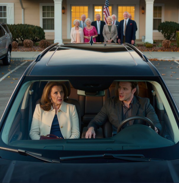 Tien minuten later zaten we in een afgesloten SUV aan de rand van de parkeerplaats van het Riverside Community Center. Door de ramen konden we de feestverlichting en de feestvierende mensen binnen zien, terwijl mijn zus een glas champagne hief als de perfecte gastvrouw.