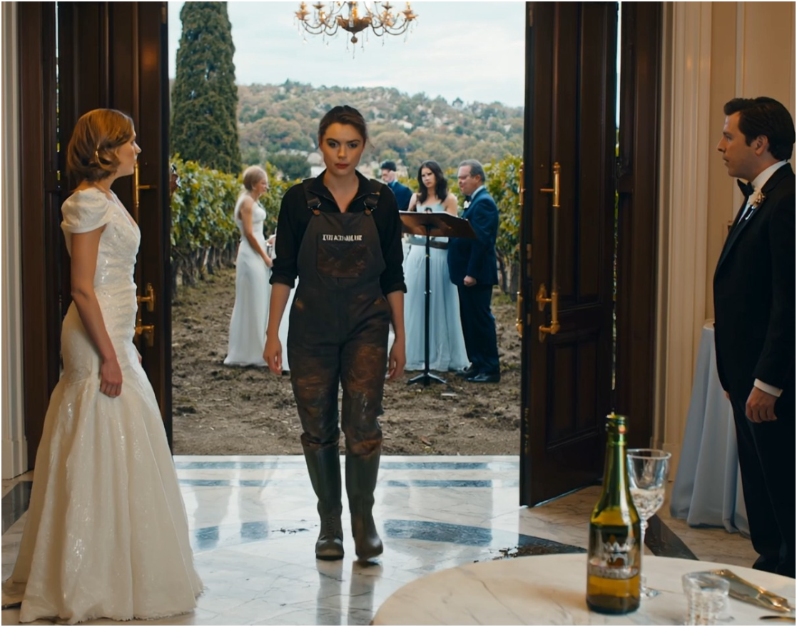 Ik zat in de modder geknield, vechtend om mijn wijnranken te redden van een vroege nachtvorst, toen een champagnekurk van 300 dollar me in mijn schouder raakte. Ik keek op en zag mijn zus Bella op mijn terras staan, in een witte jurk, lachend met de miljardairsouders van haar verloofde. Ze wees naar me en zei: