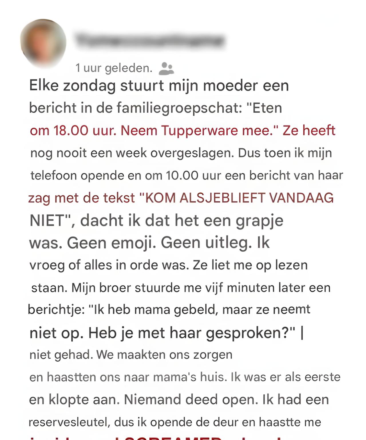 De korte rit naar mama leek een eeuwigheid te duren. Ik belde haar keer op keer, maar haar telefoon ging meteen naar de voicemail.