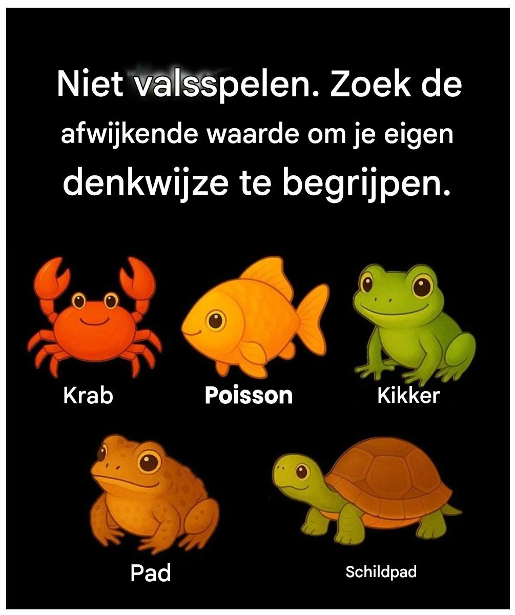Je bent deze kleine visuele puzzels vast al eens tegengekomen op sociale media: vijf schattige dieren, één vreemde eend in de bijt… en een verrassende onthulling aan het einde. Achter hun speelse uiterlijk gaan onze nieuwsgierigheid schuil: waarom kiezen we spontaan voor het ene dier boven het andere? Wat zit er achter deze directe reflex? En wat als je eerste impuls je meer vertelt over hoe je de wereld waarneemt dan je denkt? Voordat je de interpretaties ontdekt, neem even de tijd om je deze vijf metgezellen voor te stellen: een krab, een vis, een kikker, een pad en een schildpad. Welke lijkt je zonder erbij na te denken “anders”? Houd je keuze in gedachten… daar gaan we!