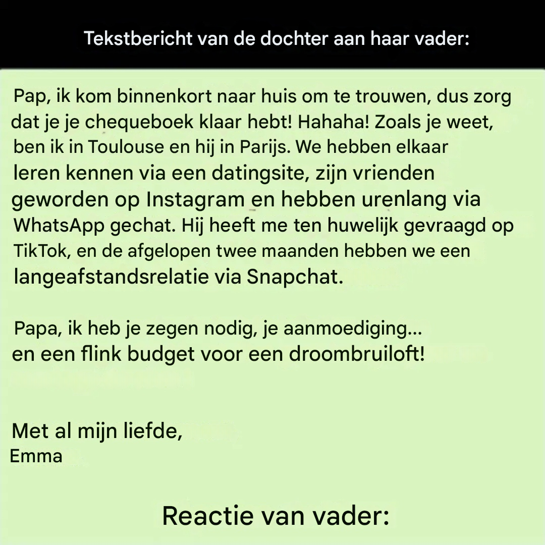 Lilly, een enthousiaste jonge vrouw, besluit haar voornemen om met haar vader te trouwen… virtueel aan te kondigen. Hoewel ze haar verloofde nog nooit in het echt heeft ontmoet, beschouwt ze hun relatie als oprecht. In plaats van een warme en emotionele reactie te ontvangen, antwoordt haar vader scherp en ironisch, waardoor hun verhaal een puur digitale ervaring wordt.