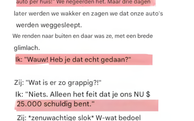 Ze legden het personeel uit dat Lily en ik uit de auto waren « gevallen » omdat de deur niet goed dicht was. Een afgezwakte, bijna geloofwaardige versie, als je tenminste de absolute gewelddadigheid van wat we hadden meegemaakt negeert.