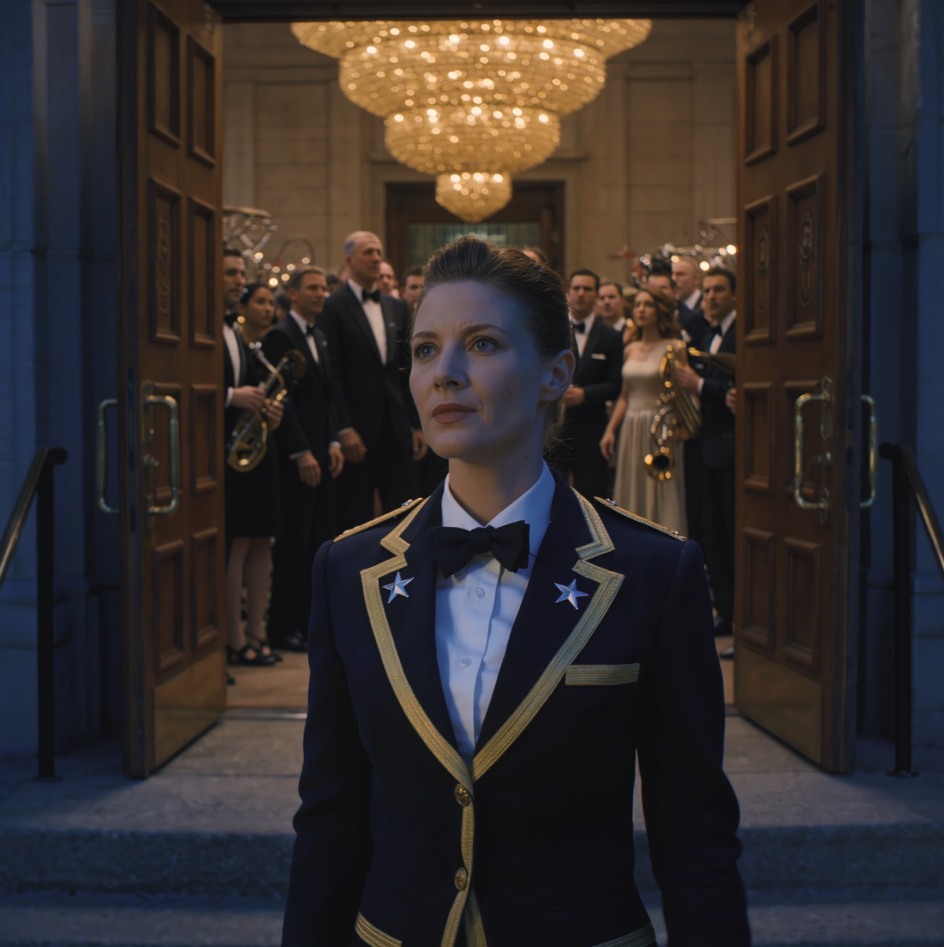 Het blauwe ceremoniële uniform verscheen, onberispelijk.