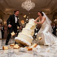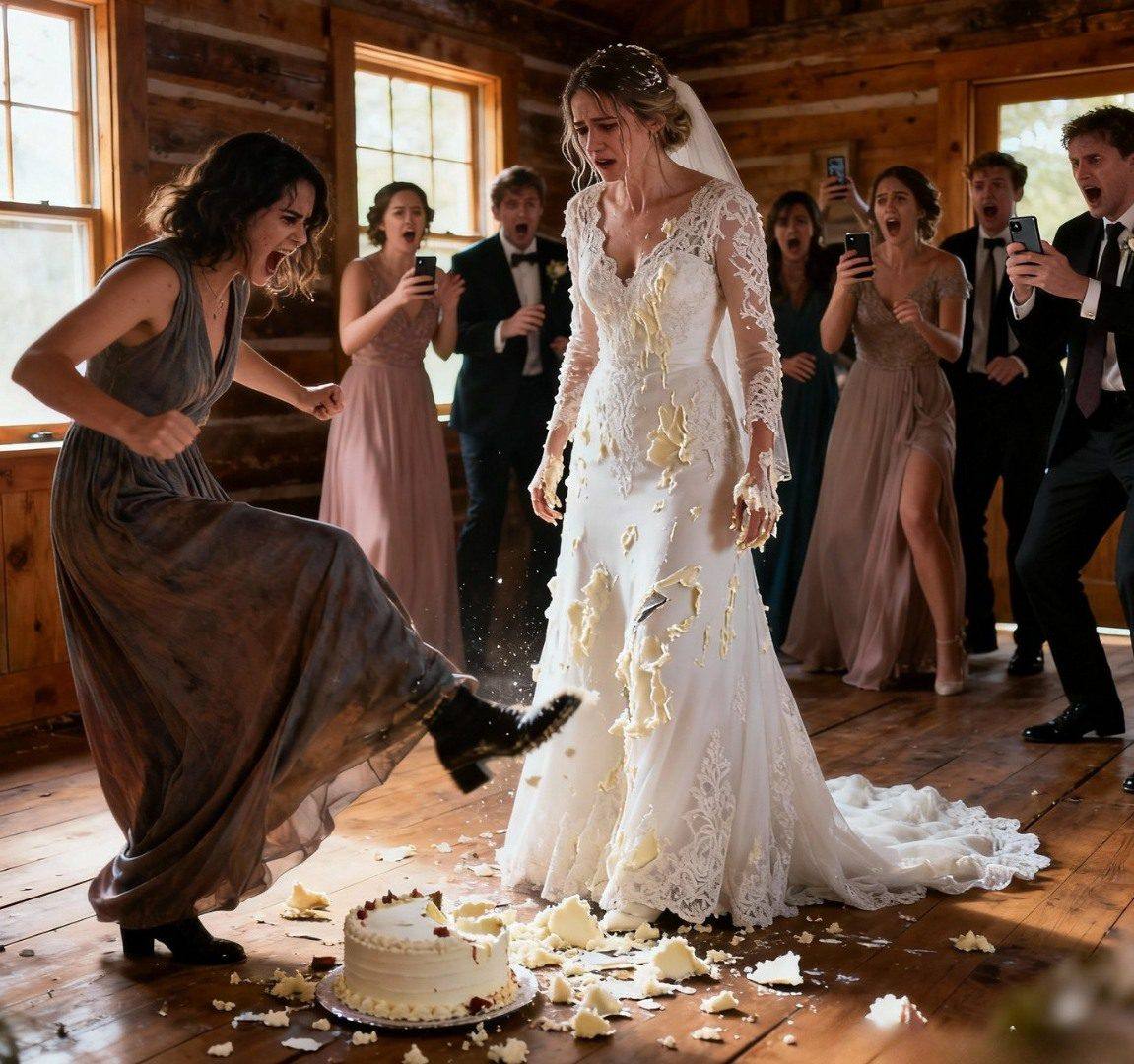 ‘Dit is wat je betaalt voor je verheven gedrag!’ schreeuwde ze, haar gezicht rood aangelopen en haar mascara al uitgelopen. Voordat iemand haar kon tegenhouden, sprong ze naar voren en ramde met beide handen in de bruidstaart.
