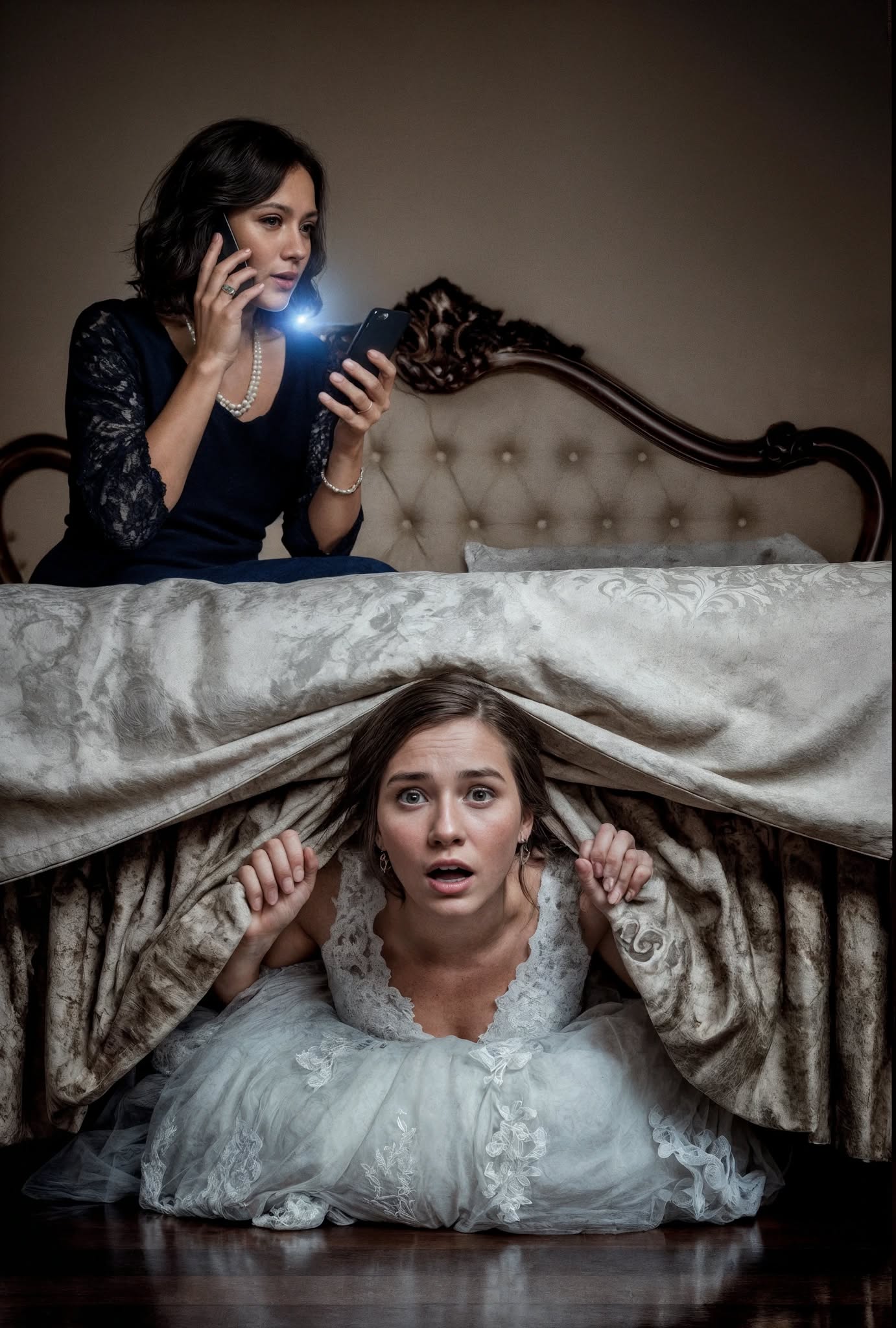 Ik hield mijn adem in, plat tegen de koude vloerplanken onder het enorme mahoniehouten bed, en probeerde een lachbui te onderdrukken. Mijn witte trouwjurk, die ik na de ceremonie nog niet eens had uitgetrokken, wapperde als een wolk om me heen, de sluier gevangen in de spijlen van het bedframe boven mijn hoofd.
