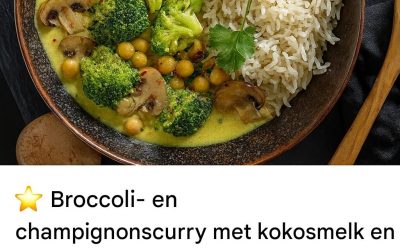 Broccoli- en champignonscurry met kokosmelk en basmatirijst belichaamt perfect de fusie van de moderne vegetarische keuken en de exotische smaken…