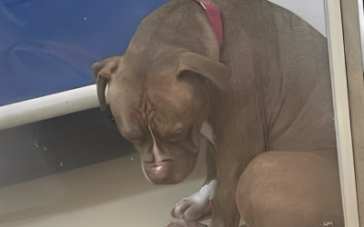 Een ontroerende foto van een pitbull, vastgelegd op het moment dat hij, zo lijkt het, definitief het geloof in een betere toekomst verliest