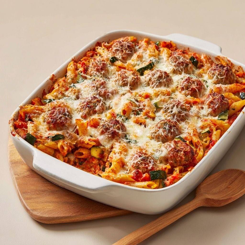 Pastaschotel met gehaktballetjes, courgette en kaas