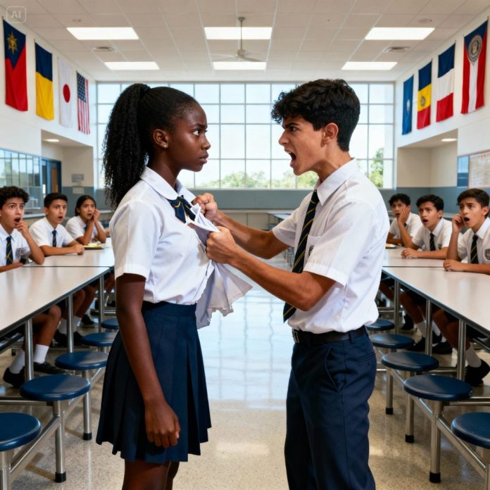Op een ochtend in oktober, terwijl iedereen op reces wachtte, besloten de drie jongens hun intimidatie een stap verder te brengen. In de lege gang van de tweede verdieping blokkeerde Ivan de uitgang met zijn armen gekruist, terwijl Sergio te dicht bij Amina kwam, mompelende zinnen die zich voordeden als “grappig”. Marcos, met een glimlach die tot doel had angst op te leggen, maakte de tovenaar om uit te reiken naar de borst van het meisje.