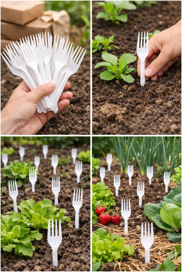 En hier komt dit verrassende idee om de hoek kijken: plastic vorken met de tanden naar boven in de grond steken, rondom de meest kwetsbare planten.