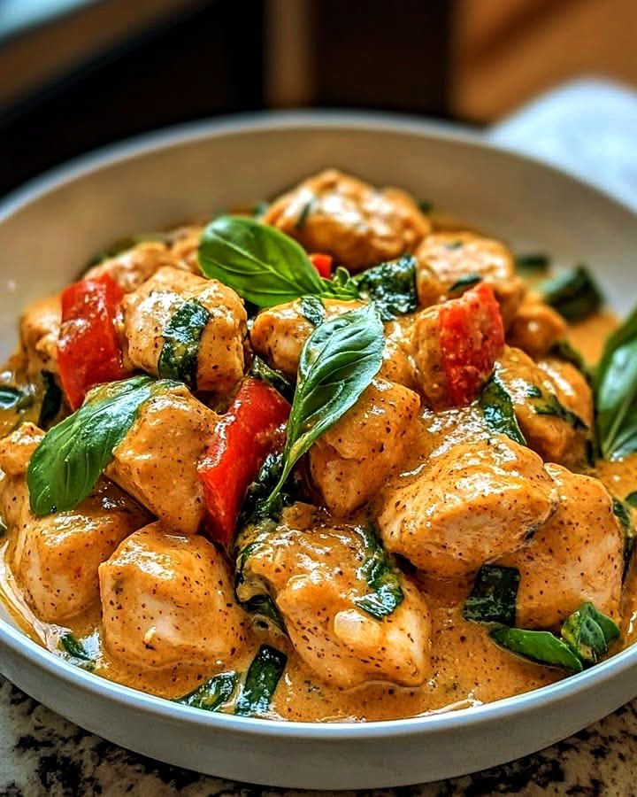 Romige Thaise kip met basilicum is een heerlijke, makkelijk te bereiden maaltijd boordevol smaak! Malse kippendijen worden gestoofd in een rijke kokoscurrysaus, verrijkt met Thaise basilicum, knoflook en gember, voor een heerlijke en gezonde maaltijd die je steeds opnieuw wilt maken.