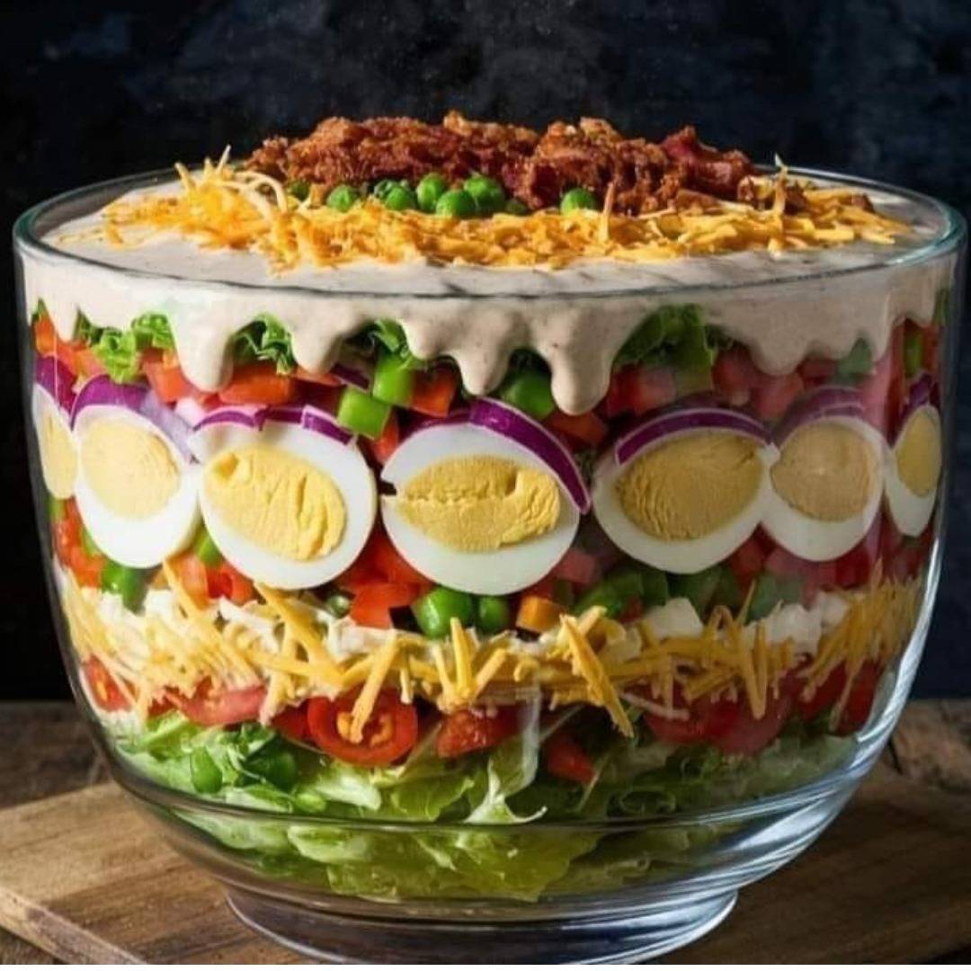 De zevenlaagse salade is een klassieker voor maaltijden met familie of vrienden. Met zijn kleurrijke lagen en gevarieerde smaken is het net zo mooi om naar te kijken als om te proeven. Gemakkelijk te bereiden, het vereist een beetje koeltijd om de ingrediënten de romige vinaigrette te laten absorberen. Deze salade is perfect voor een picknick, barbecue of als licht hoofdgerecht.