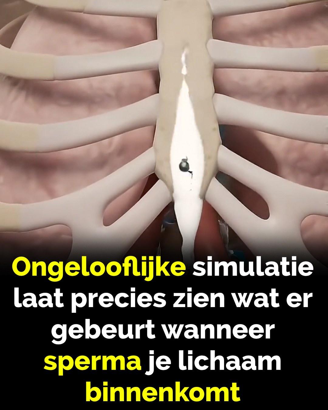 Met behulp van een huidloos anatomisch model toont de simulatie een witte vloeistof die sperma voorstelt, voordat het zijn weg naar beneden door de keel en het spijsverteringsstelsel volgt. Kleine vormpjes die sperma voorstellen, bewegen mee met de vloeistof, terwijl de clip de kijkers stap voor stap door het biologische proces leidt.