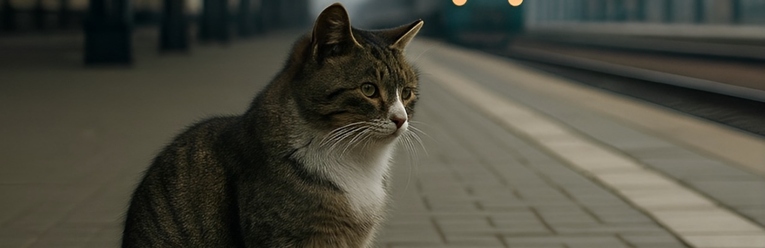 De stem van de omroeper kondigde het vertrek aan. Mensen schreeuwden, sleurden met koffers, maar mens en kat bleven zitten — naast elkaar, zwijgend. Eén van hen wist dat morgen alles zou veranderen.