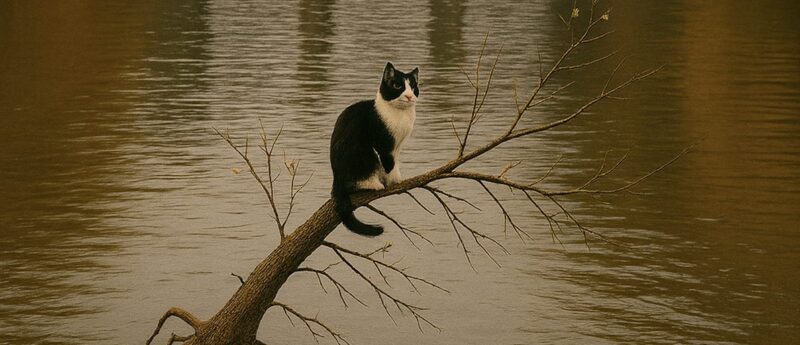 Alsof de kat het begreep, sprong hij op Michail en klemde zich met zijn klauwen in zijn schouder vast. De pijn schoot door hem heen, maar de man slaakte slechts een zucht: “Vasthouden.” Hij draaide zich om en liep terug, zijn benen met moeite bewegend. De kou verkrampte zijn lichaam, de prothese hinderde, zijn krachten raakten op. Het geluid van het water zwol aan — de golf was al dichtbij. Michail voelde de bodem, zette nog een stap en zakte in elkaar, terwijl zijn bewustzijn wegviel. Het laatste wat hij zag — de kat sprong op de oever.