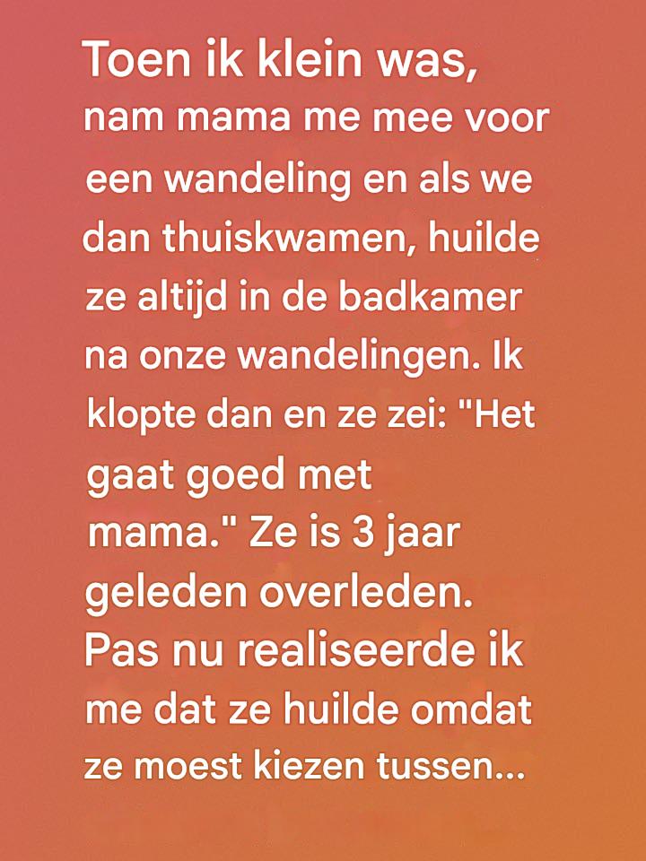 En elke keer als we thuiskwamen, sloot ze zich op in de badkamer en huilde. Ik dacht dat mijn moeder in de badkamer huilde omdat ze verdrietig was.