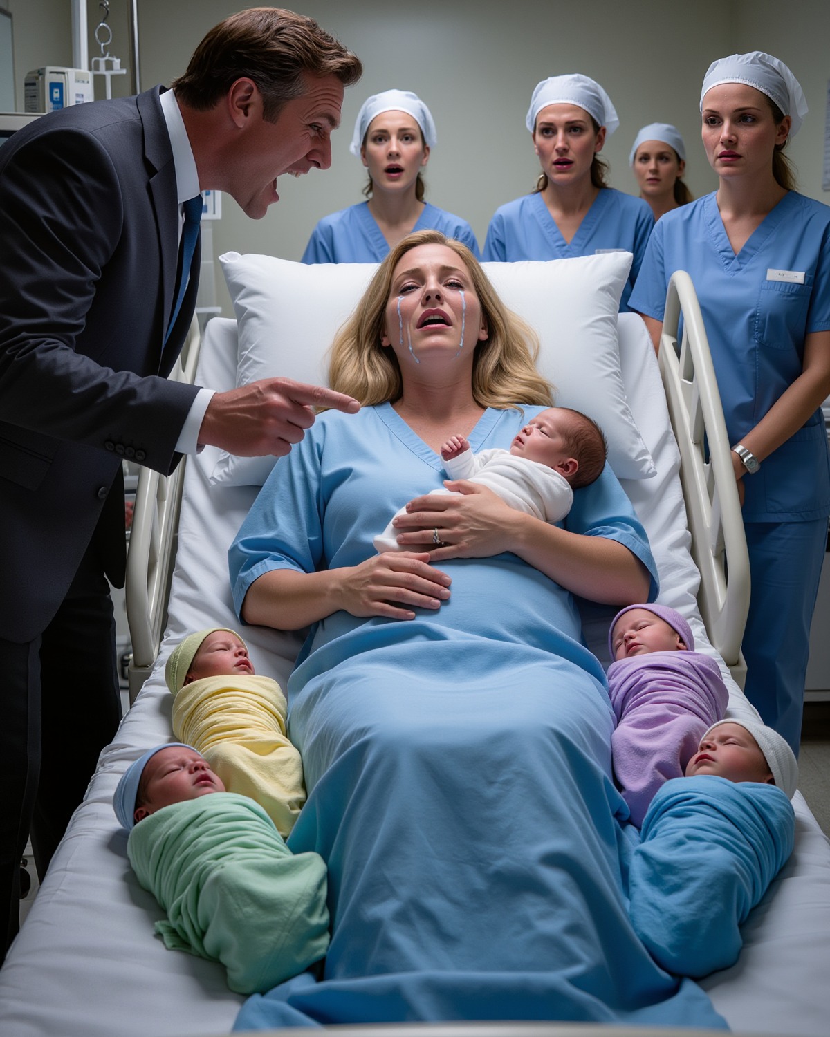 Anna lag uitgeput, rillend na urenlange weeën, haar huid vochtig van het zweet. In haar armen lagen vijf kleine pasgeborenen, elk gewikkeld in zachte, pastelkleurige dekentjes. Een drieling zou het ziekenhuispersoneel al hebben verbaasd, maar een vijfling? Dat was ongelooflijk zeldzaam. Het had een wonder moeten zijn. Toch keek niemand in de kamer met ontzag naar hen.