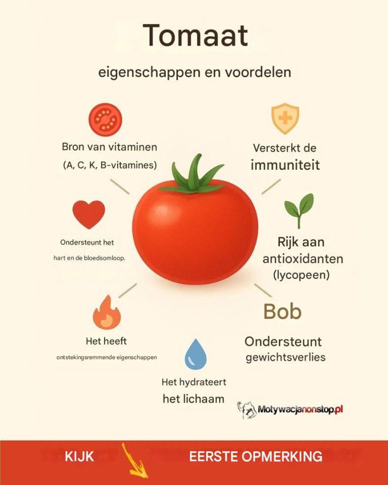 Tomaten zijn een uitstekende bron van vele vitaminen: vitamine C ondersteunt het immuunsysteem en versnelt de wondgenezing, vitamine A is goed voor het gezichtsvermogen en de huid, en vitamine K helpt bij een goede bloedstolling.